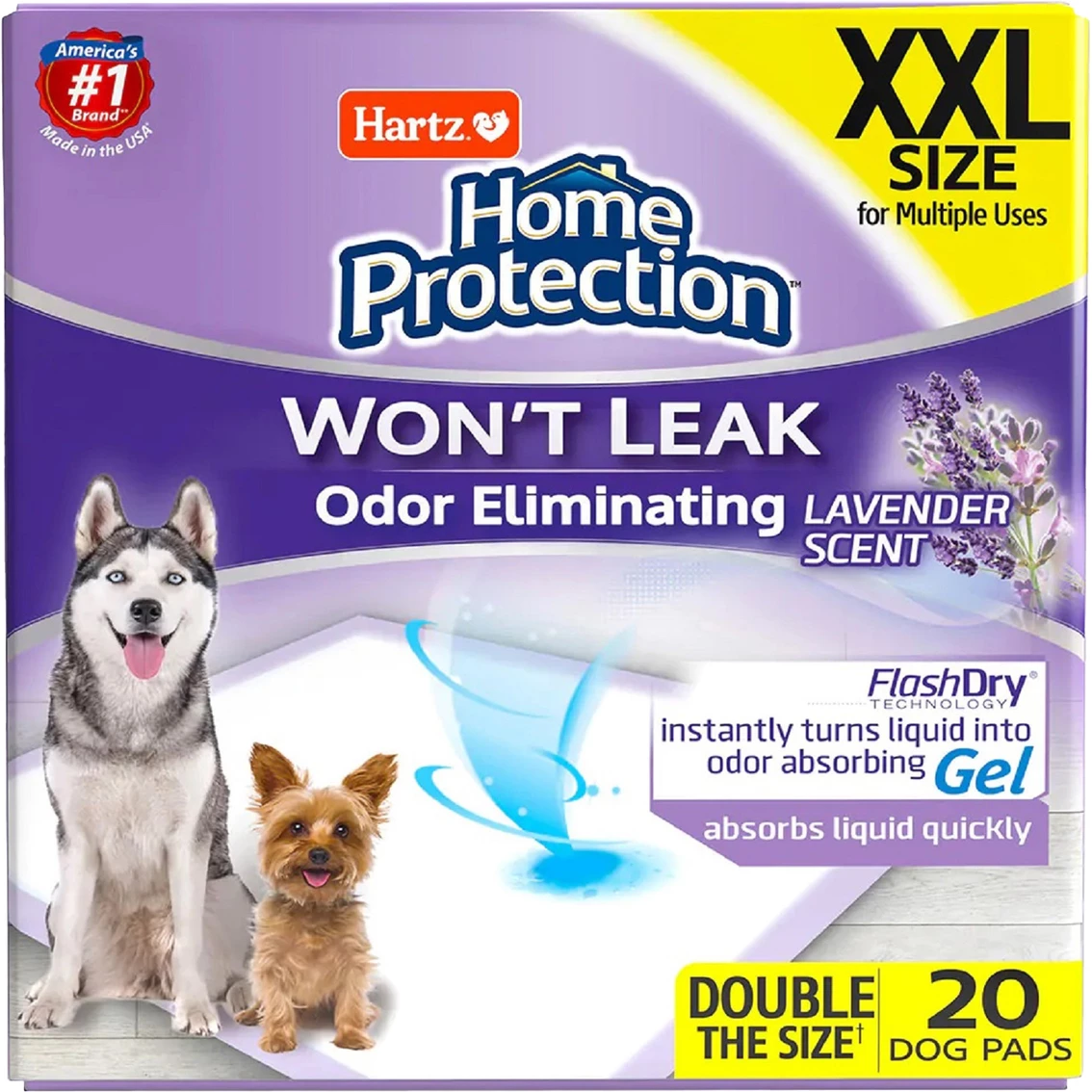 Hartz Home Protection Lavender Scent Odor Eliminating Gel Dog Pads feature unique Flash-Dry technology that instantly turns liquid into gel, locking in moisture to prevent messy leaks and unpleasant odors. Each pad measures 30 in. x 30 in. and has a plastic backing and border to protect all floor types by blocking leaks. Package includes lavender scented 20 pads.