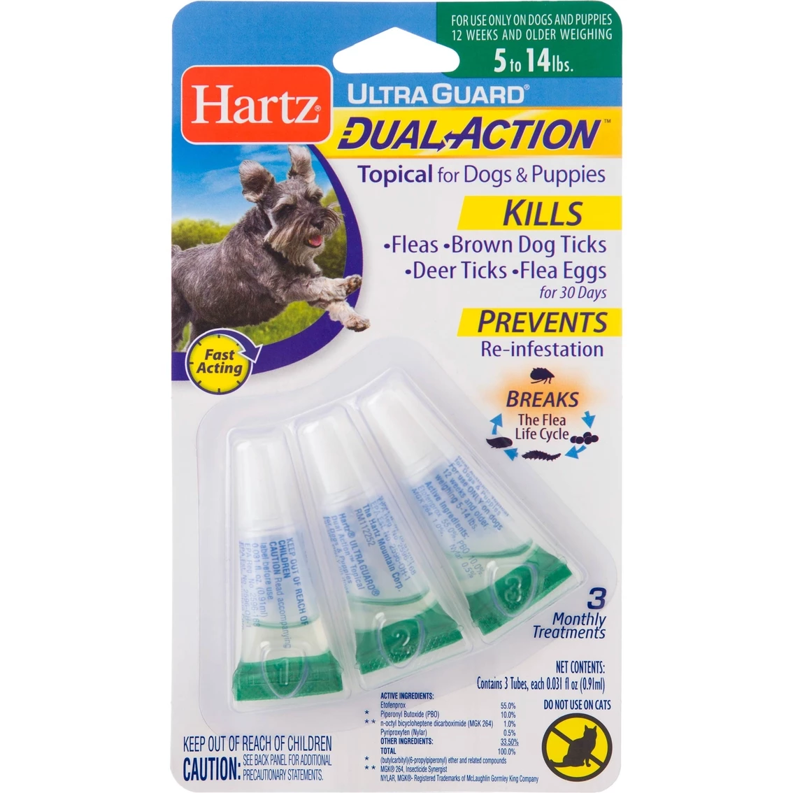 Help your canine companion fight pesky fleas and ticks with this Hartz UltraGuard Dual Action Topical Treatment for Dogs. This fast-acting formula helps to kill fleas along with brown dog ticks, deer ticks, plus it helps to prevent re-infestations. This formula lasts for 30 days, which means you only need to apply it once a month. Plus, the quick drying formula stays on and does not rub off, ensuring your pal stays protect throughout the month. This package contains 3 monthly applications. When it comes to flea and tick control, Hartz has got your pal covered! For dogs 5-14 lbs. Model: 15649.