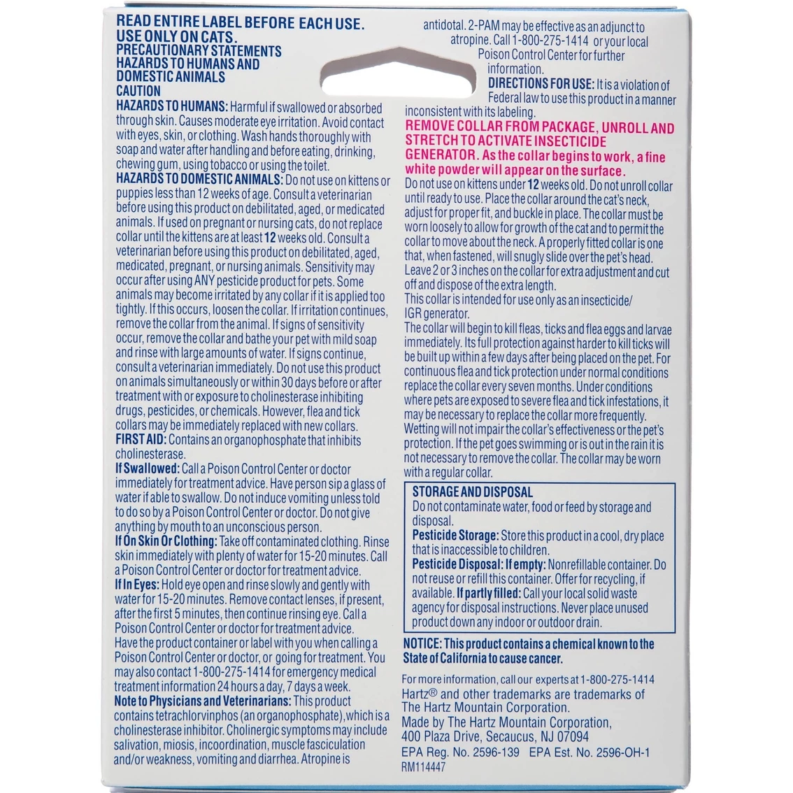 Water resistant. White collar. Kills and Repels: Fleas; Ticks. Kills and Prevents: Flea eggs for up to 7 months. Safety release snap. Reduces risk of neck injury to your cat. Use only on cats. When your cat has fleas and ticks, your family and pet may be exposed to: Lyme disease; Tapeworm infestation; Flea bite anemia; Flea allergy dermatitis. Easy Activation: To activate collar, hold at each end, stretch, and it’s ready for your cat to wear. Model: 094268.