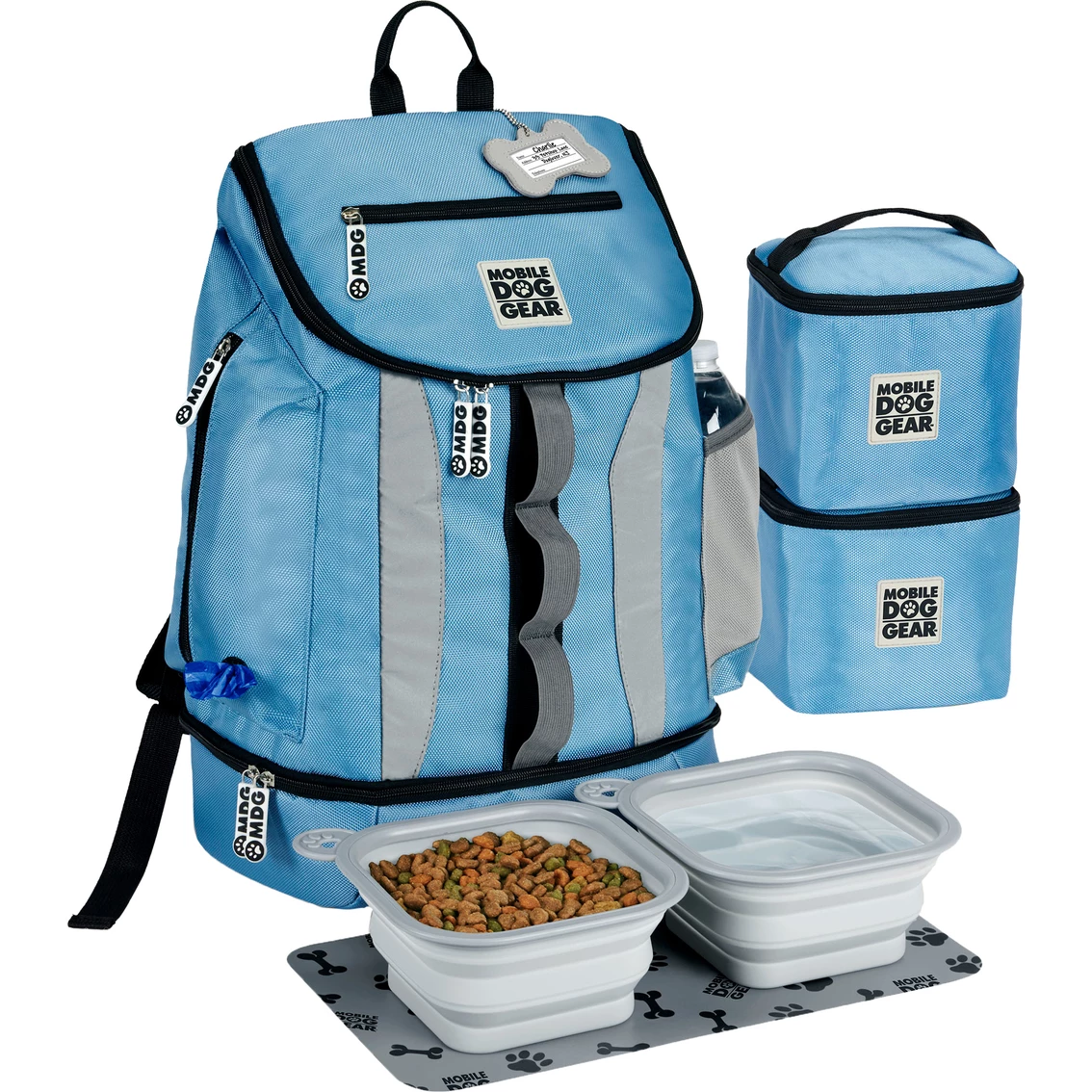 Drop Bottom Week Away Backpack for Medium and Large Dogs. Features a large zippered drop-bottom section for extra storage, large main compartment, divider for food carriers, two adjustable padded backstraps, front daisy chain elastic bands to hold apparel or towels, side mesh pocket, side zippered fabric pocket, waste bag pocket and a front zippered pocket. Also includes two 15 cup lined food carriers, placemat, and two 5 cup collapsible silicone bowls that store conveniently in the main section. This travel bag also meets most airline carry-on requirements, has fashionable rubber hardware and an ID luggage tag. Dimensions: 13 L x 19 H x 9 W