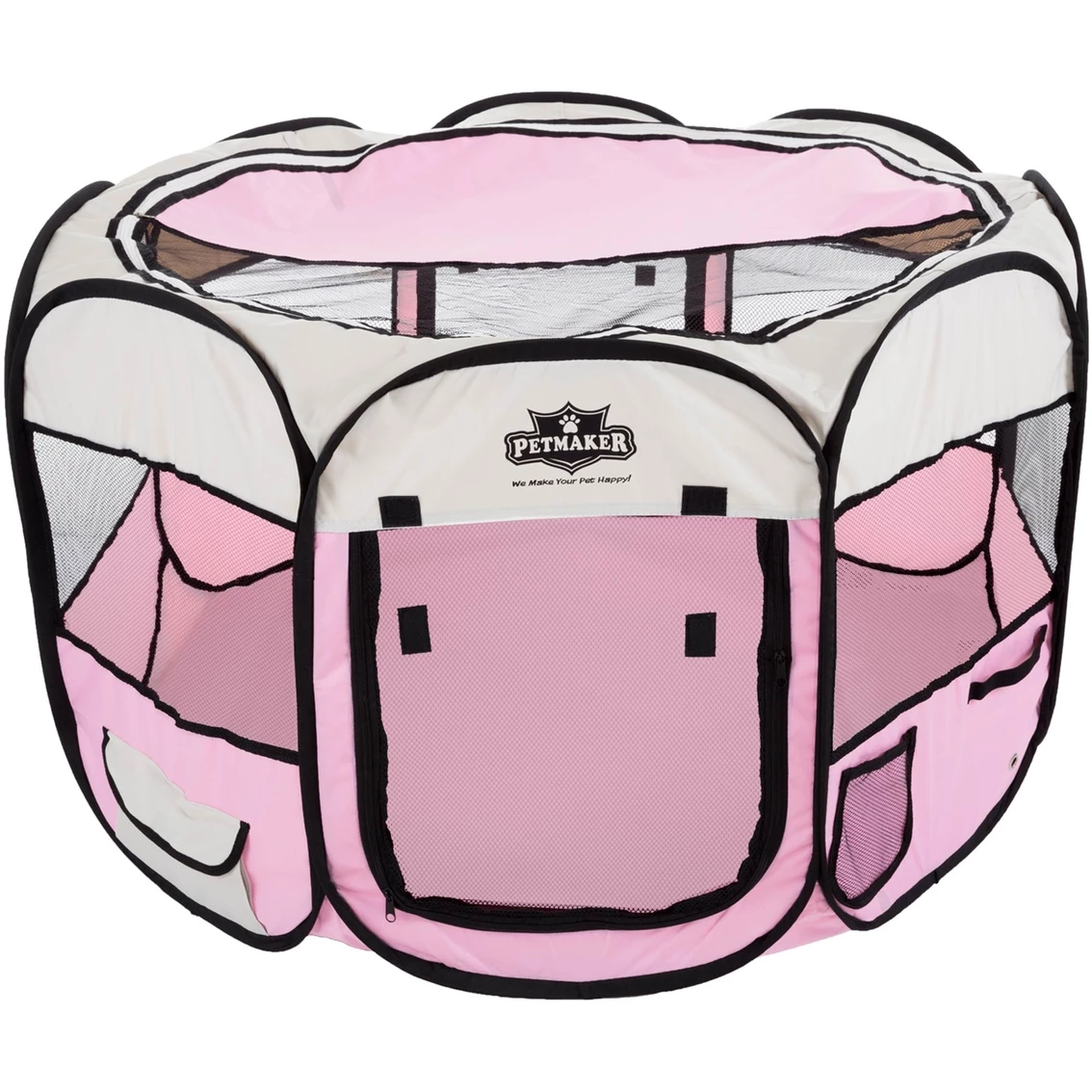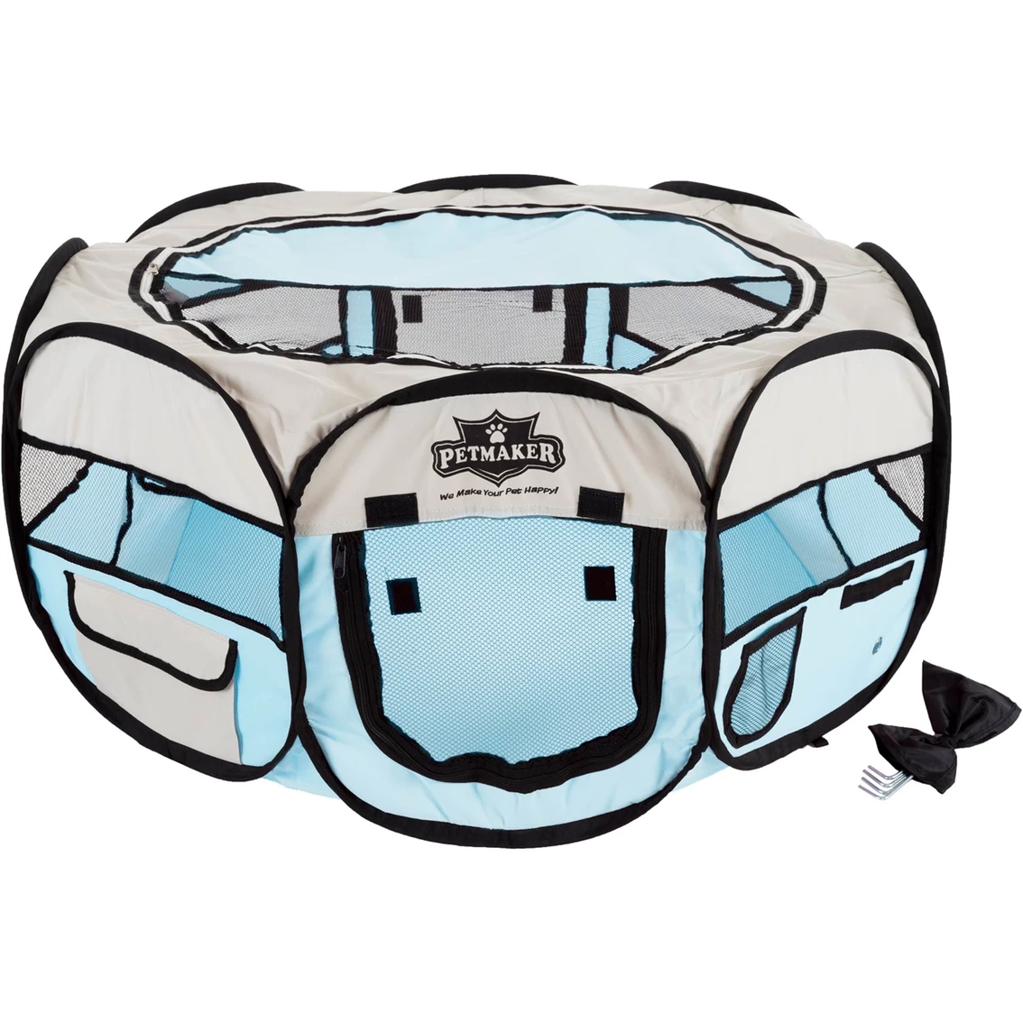 The PETMAKER Portable Pop Up Pet Play Pen takes only seconds to set up, is great for indoor or outdoor use, provides a secure and comfortable area for your pet, is water resistant and comes in a convenient durable carrying case for travel and storage. The mesh windows allow for good air circulation, and the roof is designed to provide both sun and shade options for your furry friend and is removable. Included are two pockets for storage, a hole and holder for an exterior water bottle and four easy-to-use metal stakes to secure the play pen during outdoor use. For your convenience, the pen has two doors that you can unzip to open. The pen even has Velcro tabs installed to hold the door open if you choose. Recommended for pets 25 lbs. or less. To clean, use wet cloth and mild soap. Towel or air dry. br>