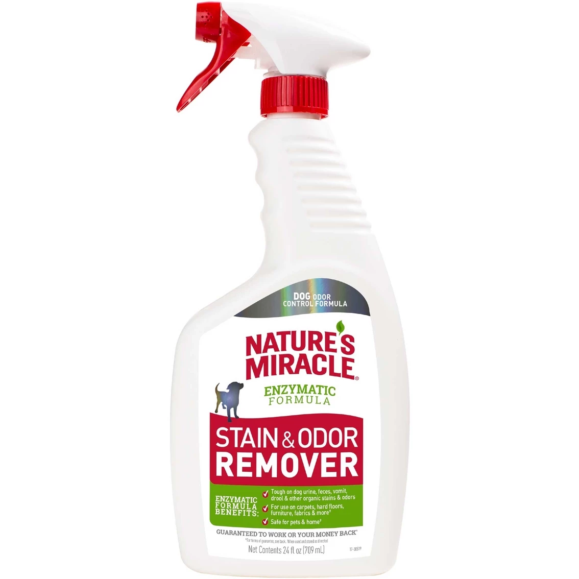Nature’s Miracle Stain and Odor Remover for dogs is tough on dog urine, feces, vomit, drool and other organic stains and odors. The bacteria-based formula produces enzymes when in contact with bio-based messes to target spot stains and odors while freshening with a light citrus scent. When used as directed, it’s safe to use on carpets, hard floors, furniture, fabrics and more. Tough on urine, drool and other organic stains and odors Freshens with a light citrus scent Bacteria-based formulas produce enzymes when they come into contact with a food source – pet urine, vomit and other bio-based messes. The enzymatic cleaner will continue working as long as the food source is present. Model: P-96962.