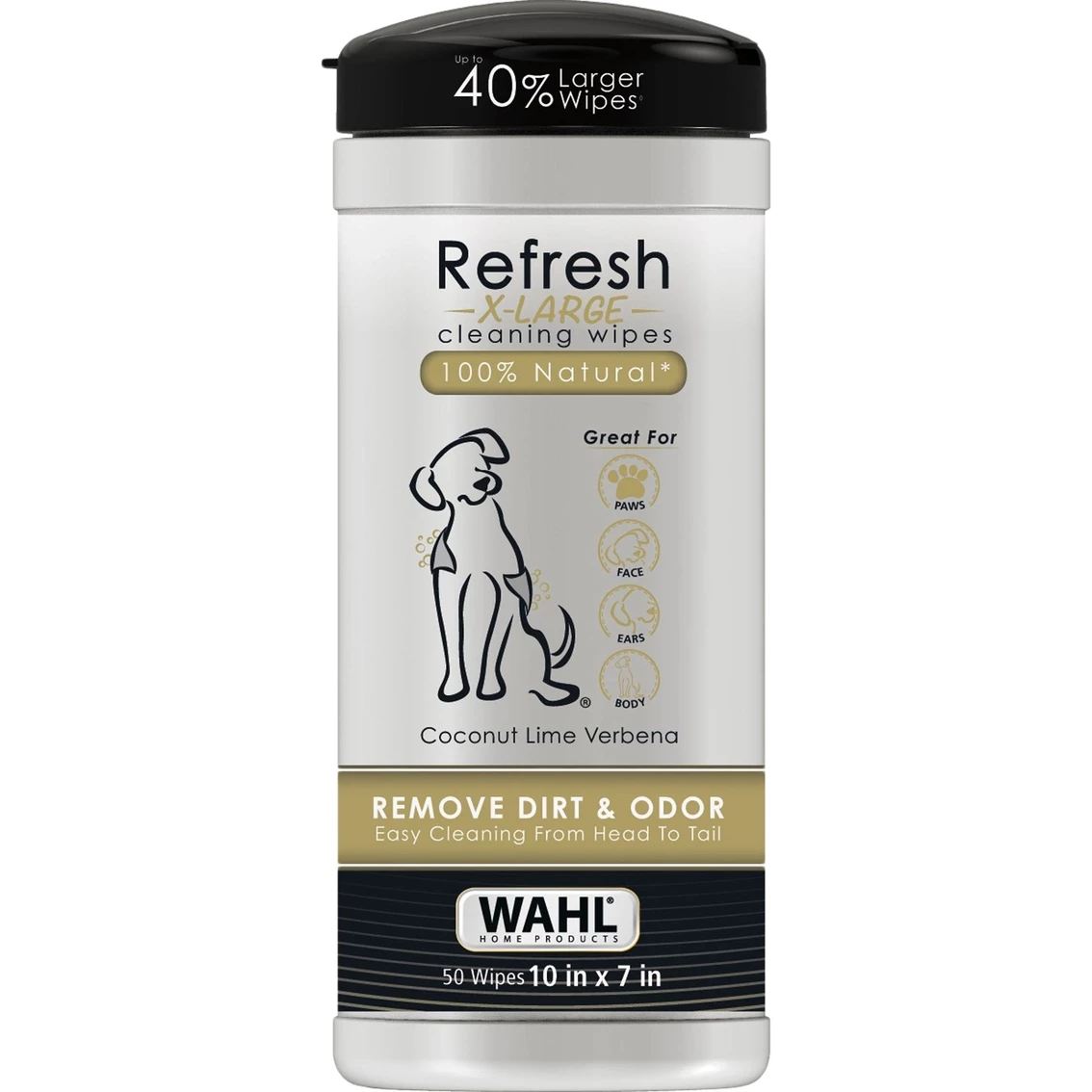 Large cleaning wipes for a quick and easy way to clean your dog from Wahl featuring a fresh coconut lime verbena scent. Remove dirt and odor from head to tail. Great for paw, face, ears and body. Leaves your dog looking clean and smelling fresh.