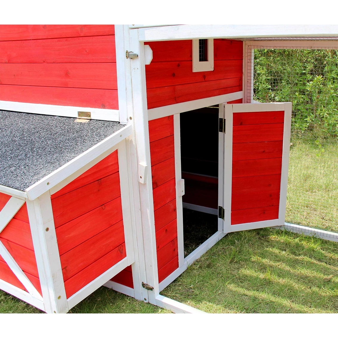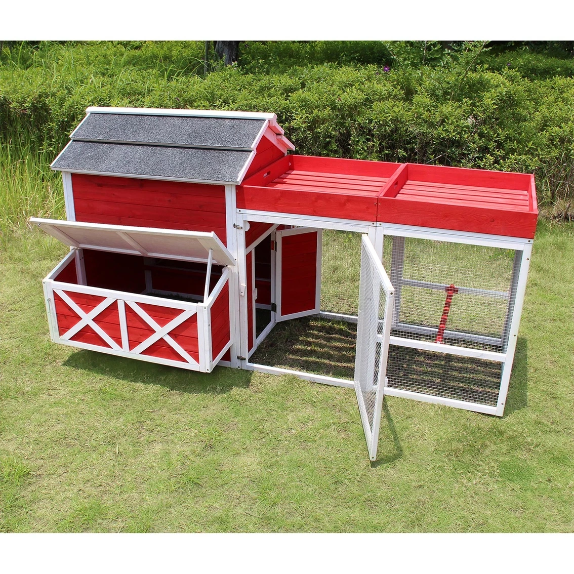 The Merry Products Red Barn Chicken Coop comes with two nesting boxes and four roosting bars. This spacious coop, which can comfortably hold 6-8 hens, provides a safe and secure habitat to raise chickens, giving you access to fresh eggs, and the ability to grow your own herbs or flowers in the rooftop planter boxes. The house and run are two separate elements, which can easily be attached or separated with a latch. Both are made of kiln-dried Cunninghamia wood, which has been treated with an oil-based stain. Perfect for the family hobby farm or green-living enthusiast in a suburban area. Hardware and easy-to-follow assembly instructions included. Model: PTH0310010401.